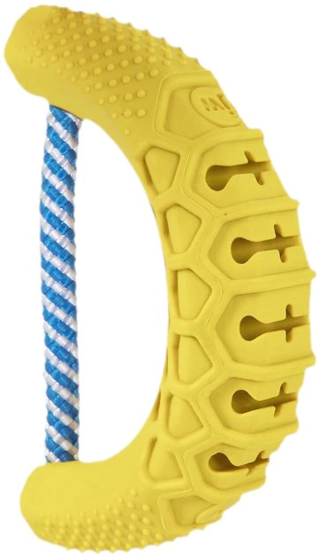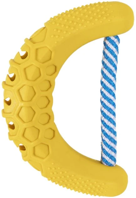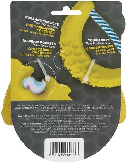 Help clean your precious pooch’s teeth without brandishing the scary toothbrush with the JW Banana Chew-ee Dog Toy. Covered in cleansing nubs, crevices and grooves, this chewtastic dog toy gently massages your pal’s teeth and gums, which can help improve his dental health and his smelly breath as he satisfies his natural urge to chew. Made of durable rubber and rope, this toy can withstand the assaults of aggressive chewers. Plus, it has a hidden inner paste pocket that is paw-fect for hiding canine toothpaste or his favorite spreadable treat, which can encourage him to chew and play for hours!
