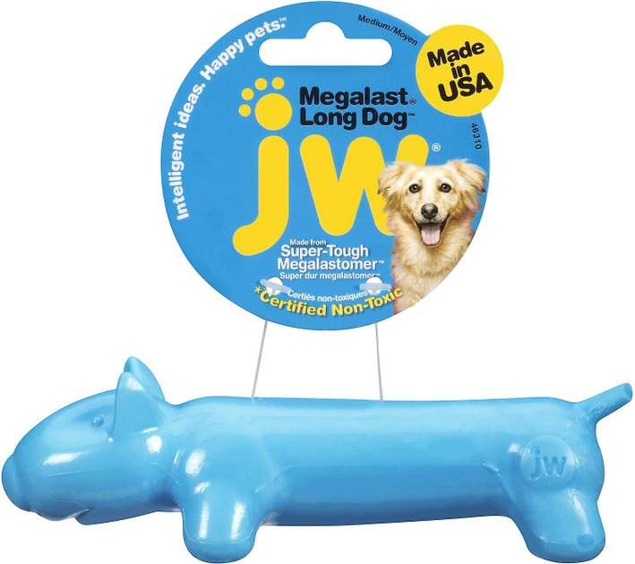 Every pup needs a pal, and this one is tough enough to stick around through the roughest of play! The Megalast “Long Dog” Dog Toy from JW Pet is made from the latest Thermo Plastic Rubber, giving it a tough demeanor that loves to be chewed. The vanilla scent and squeaker make it even more fun for gnaw-happy dogs. When the chewing is over, “Long Dog” loves to be fetched! He bounces and floats, too!