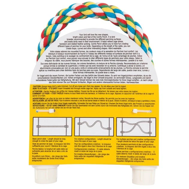 Give your bird a comfortable place to perch with the JW Pet Small Comfy Bird Perch. It’s a simple, multi-colored rope that you can twist and bend to create all sorts of fun shapes for your pet to explore. Each end easily attaches to a wire cage, and the rope will hold its shape without exposing dangerous wires. Pet birds need perches of varying lengths, thicknesses, styles and materials to keep their feet healthy and their grip strong. The JW Pet Small Comfy Bird Perch makes a colorful and fun addition your bird’s perching choices.
