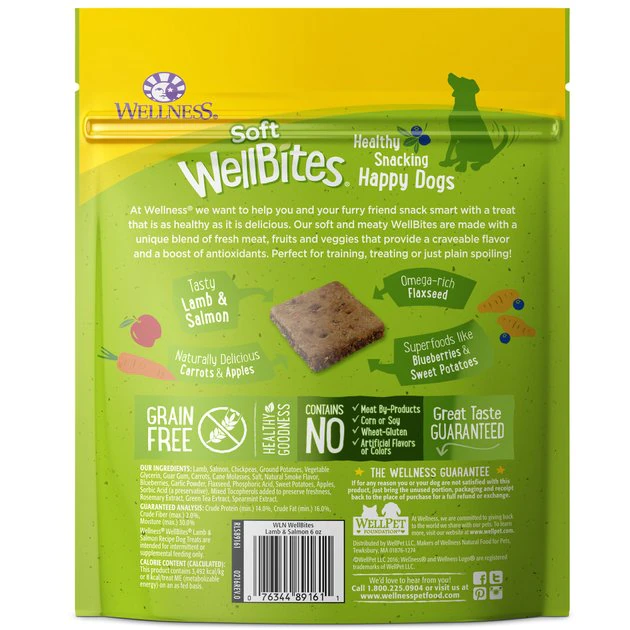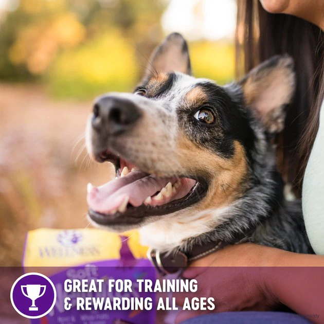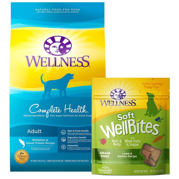 Give your dog the winning combo of Wellness Complete Health Adult Whitefish & Sweet Potato Recipe Dry Food + WellBites Lamb & Salmon Recipe Soft & Chewy Grain-Free Dog Treats! Make your sidekick’s next supper special with Wellness Complete Health Whitefish & Sweet Potato. This natural dry food for dogs is specially formulated to provide whole body nutritional support. It is crafted using carefully chosen ingredients that include premium proteins and wholesome grains supported by omega fatty acids, antioxidants, glucosamine, probiotics and taurine. This balanced, healthy dry dog food is designed to encourage a strong immune system, optimize energy levels and ensure a healthy skin and coat while promoting whole body health. It is developed without any GMOs, meat by-products, fillers or artificial preservatives so you can be sure Rover is always getting the right food. Don’t forget to give your loving dog a reward that’s both nutritious and delicious with Wellness WellBites Lamb & Salmon Dog Treats. These soft and chewy treats are crafted with a unique blend of healthy ingredients including lamb, salmon, carrots, apples and superfoods like blueberries and sweet potatoes. Made without grains, by-products, corn, soy, gluten, artificial flavors or colors, these beneficial bites are paw-sitively perfect for training, treating or just plain spoiling! So, give your furry friend more than just a treat, give him Wellness!