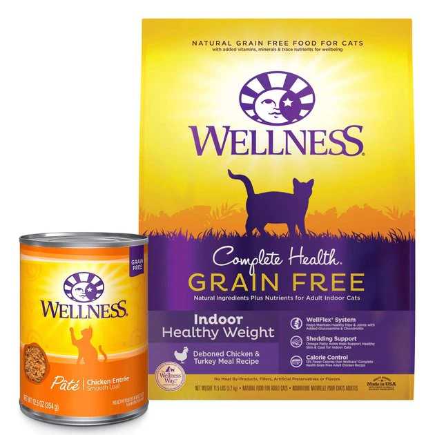 Nourish your indoor kitty’s nose-to-tail well-being with the protein-rich nutrition of Wellness’s Complete Health food. With our Wellness Complete Health Pate Chicken Entree Grain-Free Canned Cat Food & Wellness Complete Health Grain-Free Indoor Healthy Weight Chicken Recipe Dry Cat Food bundle, you can support their overall well-being and ensure they’re getting all of the protein and nutrients that they need. Serve up a bowl and feel good about providing your pal with everything he needs to thrive and nothing you wouldn’t want him to eat, like fillers or anything artificial. Plus, the savory sauce will keep him coming back for more!