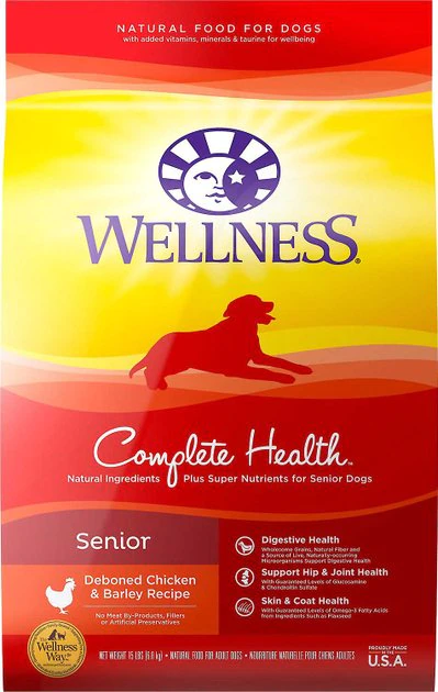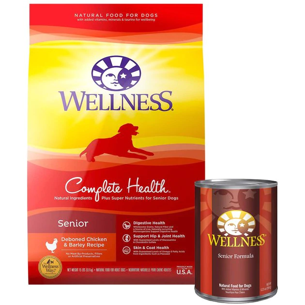 Support your senior sidekick with Wellness Complete Health Senior Deboned Chicken & Barley Recipe Dry Dog Food + Canned Dog Food. This dry and canned food combo is specially formulated for senior dogs to encourage healthy brain development, optimize energy levels and ensure a healthy skin and coat while promoting whole body health. Meanwhile, the pate-style wet dog food features a savory flavor and mouth-watering texture that dogs love while supporting a strong immune system, optimal energy levels, digestive function and a healthy coat and skin. Plus, both feeds were developed without any GMOs, meat by-products, fillers or artificial preservatives so you can be sure Rover is always getting the right food.